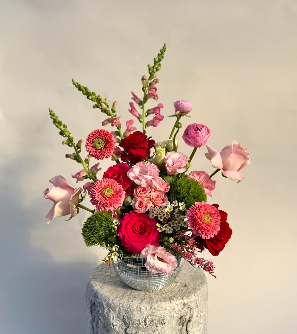 Designed in a shimmering disco ball and filled with lush pinks, reds, and soft whites. Perfect for someone who loves flowers with personality.