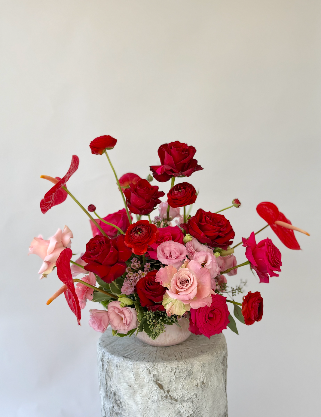 A beautiful display of roses and anthurium in a blush pink vessel.